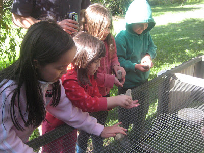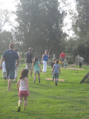 The gang (with rubber boots provided by Farmer Scott and Louise) is off to feed the ducks.