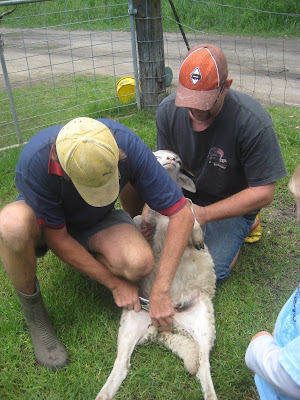 The sheep were first dewormed. Scott injected white medicine into their mouths via syringe. Then for the males that were still young, we had to castrate them but putting a rubber band around the scrotum. Eventually after about 2 weeks, without any blood circulation, the scrotum will fall off!